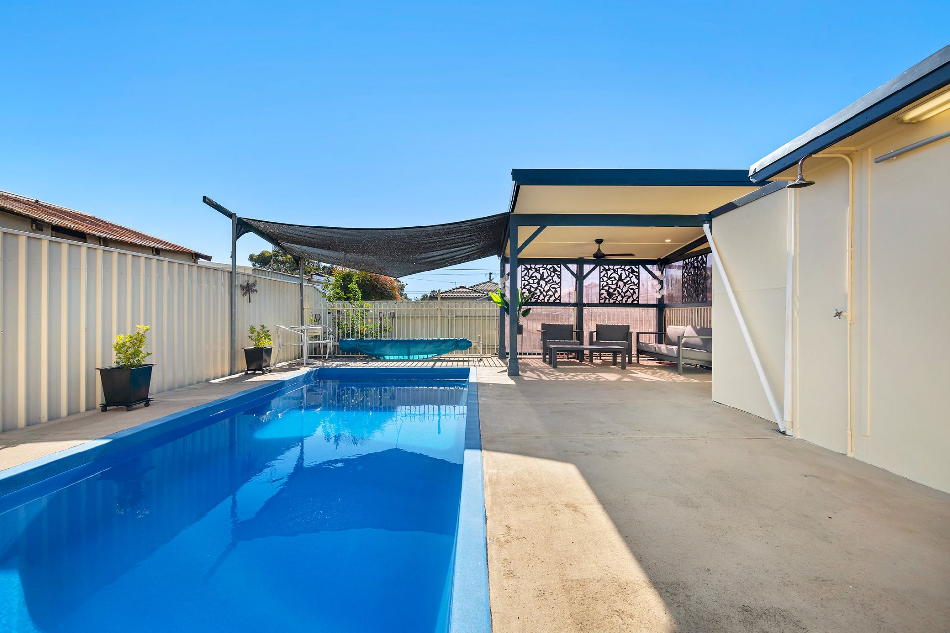 - Quality in ground fiberglass lap pool with poolside patio and convenient bathroom