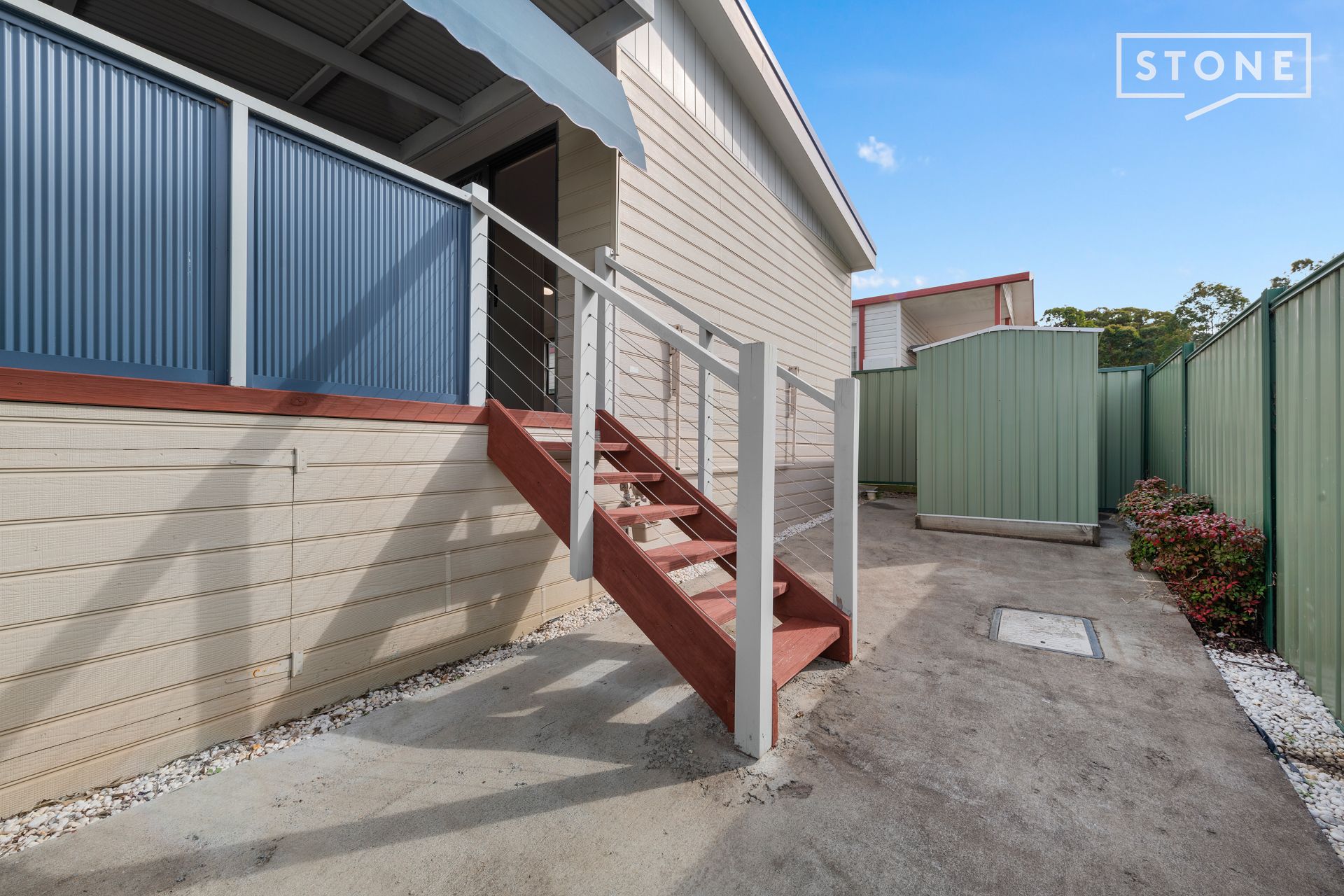-Fenced easy care concrete sealed courtyard with garden shed