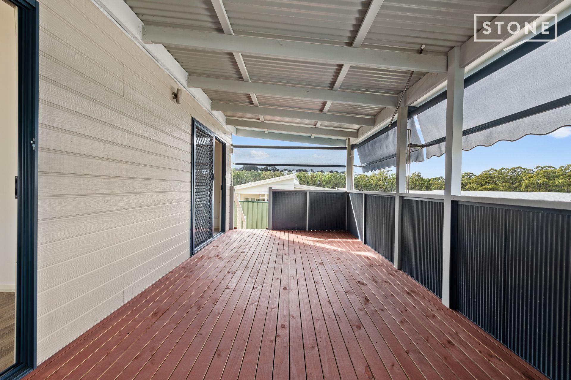 -Newly built covered deck with outdoor porch/cafe blinds and a beautiful leafy outlook